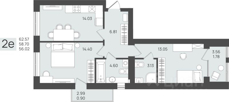 Продаётся 2-комнатная квартира в строящемся доме (Дом 3), срок сдачи: IV-кв. 2026, общей площадью 58.7 кв.м., на 4 этаже.