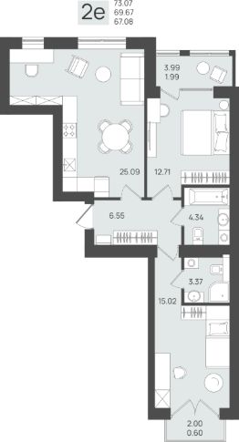 Продаётся 2-комнатная квартира в строящемся доме (Дом 3), срок сдачи: IV-кв. 2026, общей площадью 69.67 кв.м., на 5 этаже.