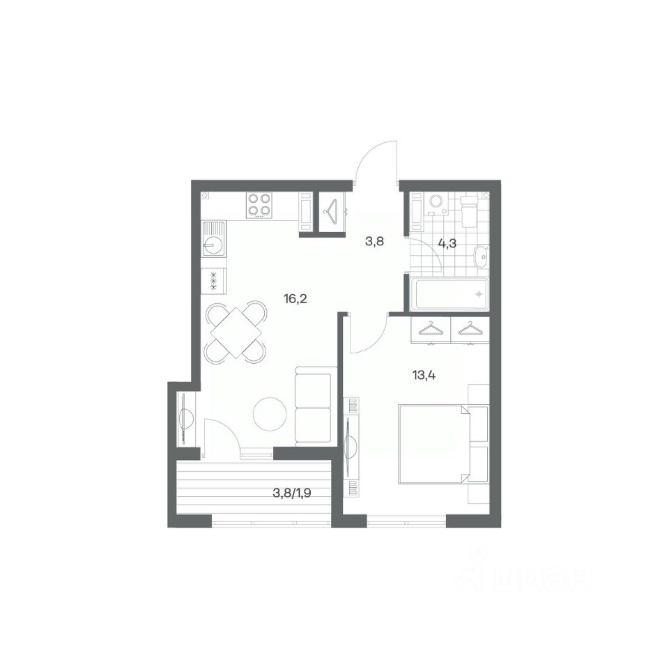 в Гагарина 30 от компании ГК "ТРЕСТ". Площадь кухни 16.2 м². Жилой комплекс комфорт-класса "Гагарина 30" расположен в Ленинградском районе Калининграда на улице Юрия Гагарина. Жилой комплекс включает в себя три корпуса высотой 9-18 этажей. Срок сдачи намечен на 1 квартал 2028 года.
