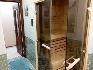 Есть витражная лоджия, выполнен дизайнерский ремонт, несколько санузлов, сауна.