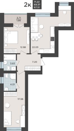 Продаётся 2-комнатная квартира в строящемся доме (Дом 1 очередь 8), срок сдачи: IV-кв. 2026, общей площадью 69.37 кв.м., на 6 этаже. Жилой квартал "Невский парк" - один из самых зеленых жилых кварталов Калининграда.