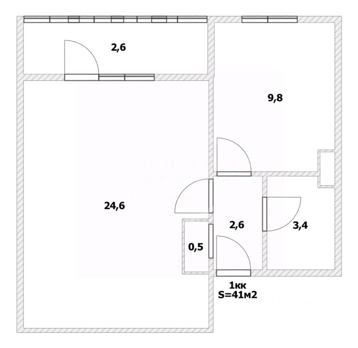 Квартира общей площадью 41 кв. м. обладает просторной комнатой 24,6 кв. м. с выходом на лоджию 2,6 кв. м, и кухней 9,8 кв. м. Дополнительным преимуществом является раздельный санузел 3,4 кв. м.