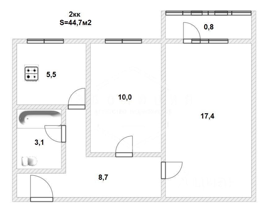 Общая площадь квартиры 44,7 кв.м, включающая в себя просторную комнату площадью 17,4 кв.м с выходом на застекленную лоджию и комнату 10 кв.м, удобную кухню, размером 5,5 кв.м , которая обеспечивает максимум комфорта и удобства.