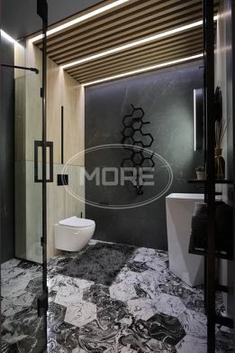 Напольное покрытие М1, произведенное в Германии, полностью имитирует натуральный паркет, со 100%-ой влагостойкостью. В санузле использовался испанский керамогранит.
