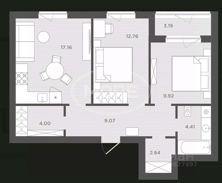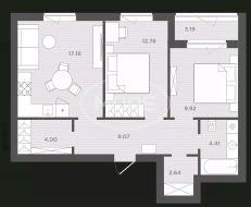 Жилая — 22,68 кв. м, площaдь кухни — 17,16 кв. м.