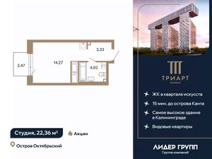 "ТРИАРТ Резиденс" — невероятный и впечатляющий премьерный проект ГК "Лидер Групп" в Калининграде. Домартобъект расположен на острове Октябрьский, в центре нового культурного кластера федерального значения и в 15 минутах ходьбы от кафедрального собора. Территория обладает отличной транспортной доступностью, здесь создается принципиально новая городская среда, превращающая локацию в ультрасовременный центр общественноделовой жизни региона.