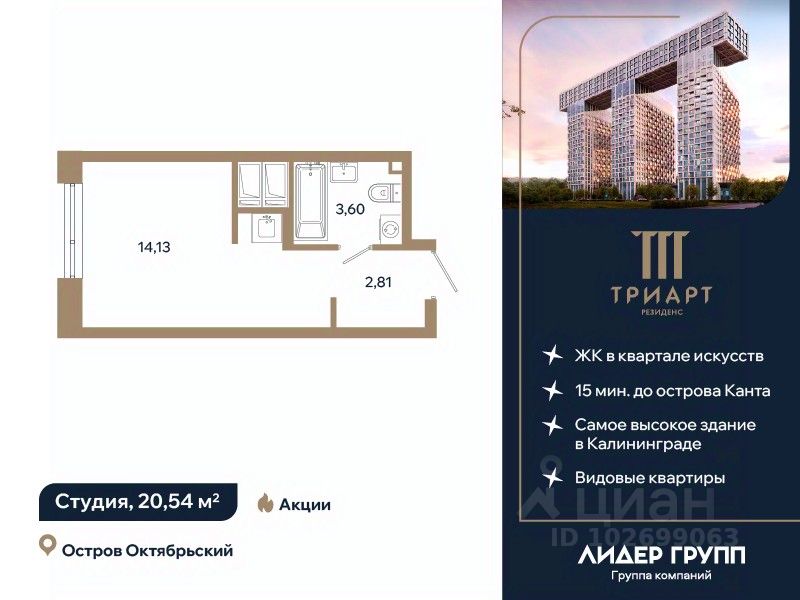 "ТРИАРТ Резиденс" — невероятный и впечатляющий премьерный проект ГК "Лидер Групп" в Калининграде. Домартобъект расположен на острове Октябрьский, в центре нового культурного кластера федерального значения и в 15 минутах ходьбы от кафедрального собора. Территория обладает отличной транспортной доступностью, здесь создается принципиально новая городская среда, превращающая локацию в ультрасовременный центр общественноделовой жизни региона.
