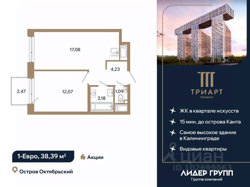 "ТРИАРТ Резиденс" — невероятный и впечатляющий премьерный проект ГК "Лидер Групп" в Калининграде. Домартобъект расположен на острове Октябрьский, в центре нового культурного кластера федерального значения и в 15 минутах ходьбы от кафедрального собора. Территория обладает отличной транспортной доступностью, здесь создается принципиально новая городская среда, превращающая локацию в ультрасовременный центр общественноделовой жизни региона.