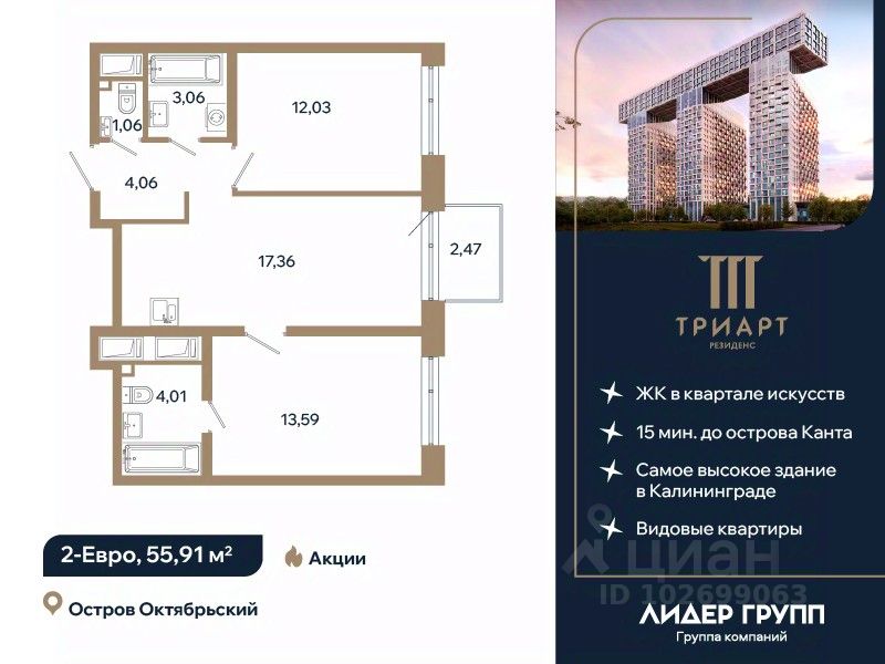 "ТРИАРТ Резиденс" — невероятный и впечатляющий премьерный проект ГК "Лидер Групп" в Калининграде. Домартобъект расположен на острове Октябрьский, в центре нового культурного кластера федерального значения и в 15 минутах ходьбы от кафедрального собора. Территория обладает отличной транспортной доступностью, здесь создается принципиально новая городская среда, превращающая локацию в ультрасовременный центр общественноделовой жизни региона.