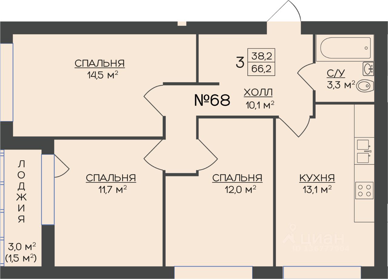 Продаётся 3-комнатная квартира в строящемся доме (Дом 1), срок сдачи: IV-кв. 2026, общей площадью 66.2 кв.м., на 2 этаже. Новые жилые дома от Специализированного застройщика "Акфен" расположены в г. Пионерский на ул. Новоставского.