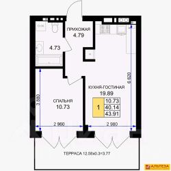 Продается 1-комнатная квартира, расположенная на 1-м этаже 7-миэтажного жилого дома на ул.Катериничева, в г.Гурьевске. Общая площадь - 43,91 кв.м., комната-10,73 кв.м., кухня-19,89 кв.м. В квартире имеется большая терраса шириной 2м. Автономное отопление. Срок сдачи дома- 3 кв. 2027 года.