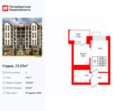 Удобная, классическая, функциональная европланировка, большая кухня-гостиная 5.6 м², вместительная прихожая 2.9 м². Общая площадь студии - 23.03 м², жилая 9.61 м², высота потолка 3 м.