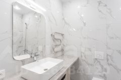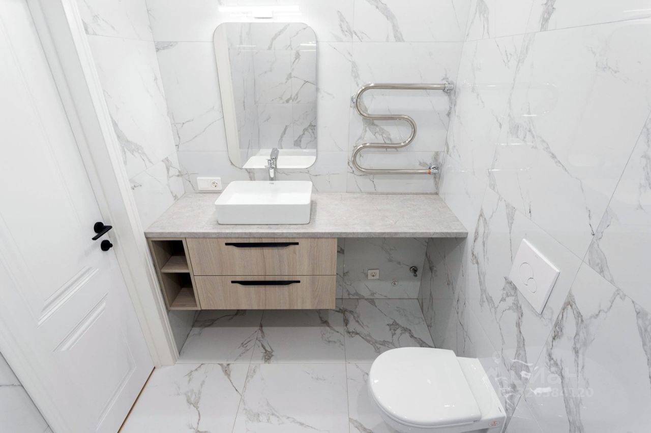 В ванной комплект инсталляция с унитазом, зеркало с подсветкой, тумба с раковиной и смесителем, удобные розетки, ванна.