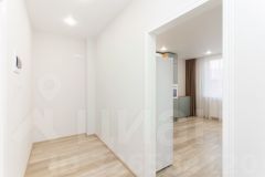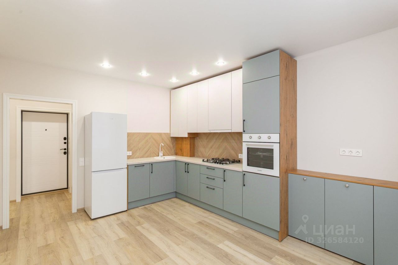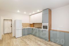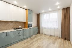На кухне сушилка для посуды, мойка из искусственного камня, навесные шкафы со вскрытой системой открывания, встраиваемая вытяжка с выдвижной панелью, газовая варочная поверхность, встраиваемый духовой электрический шкаф. Предусмотрено место для встраиваемой посудомоечной машины.