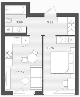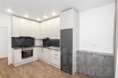 На кухне сушилка для посуды, мойка из искусственного камня, навесные шкафы со вскрытой системой открывания, встраиваемая вытяжка с выдвижной панелью, газовая варочная поверхность, встраиваемый духовой электрический шкаф. Предусмотрено место для встраиваемой посудомоечной машины.