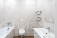В ванной комплект инсталляция с унитазом, зеркало с подсветкой, тумба с раковиной и смесителем, удобные розетки, ванна.