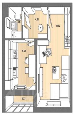 Плoщaдь квapтиpы - 37, 9 м кв.,