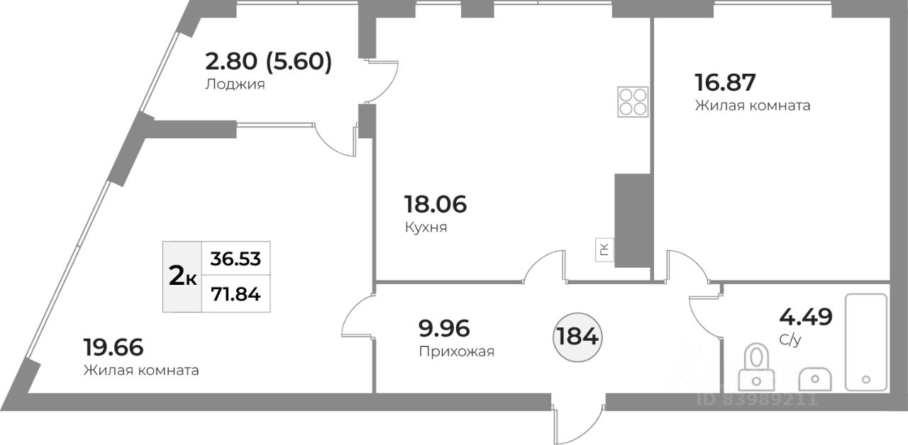 Продается 2-комн. квартира, 71,84 м²