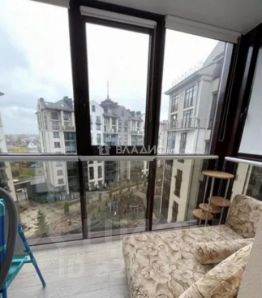 Общая площадь квартиры 74,8 кв.м., площадь комнат 33,4 (17,4+16,0), кухня площадью 24,6 кв.м., имеется балкон и лоджия с панорамными окнами, что даёт дополнительный свет в квартире.