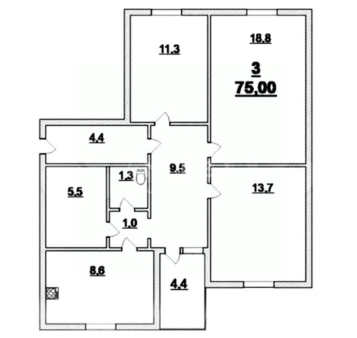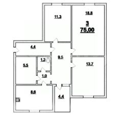 Общая площадь квартиры 75м2, кухня 8.6м2, три изолированные комнаты: 11.3 / 18.8 /13.7 - 2 спальни и гостиная с зонированием рабочих мест. Утепленная лоджия - можно использовать как кабинет. Теплые полы в лоджии, санузле и прихожей.