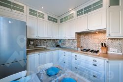 Удобная кухня квадратной формы с современной встроенной техникой - духовой шкаф, СВЧ - печь, посудомоечная машина.