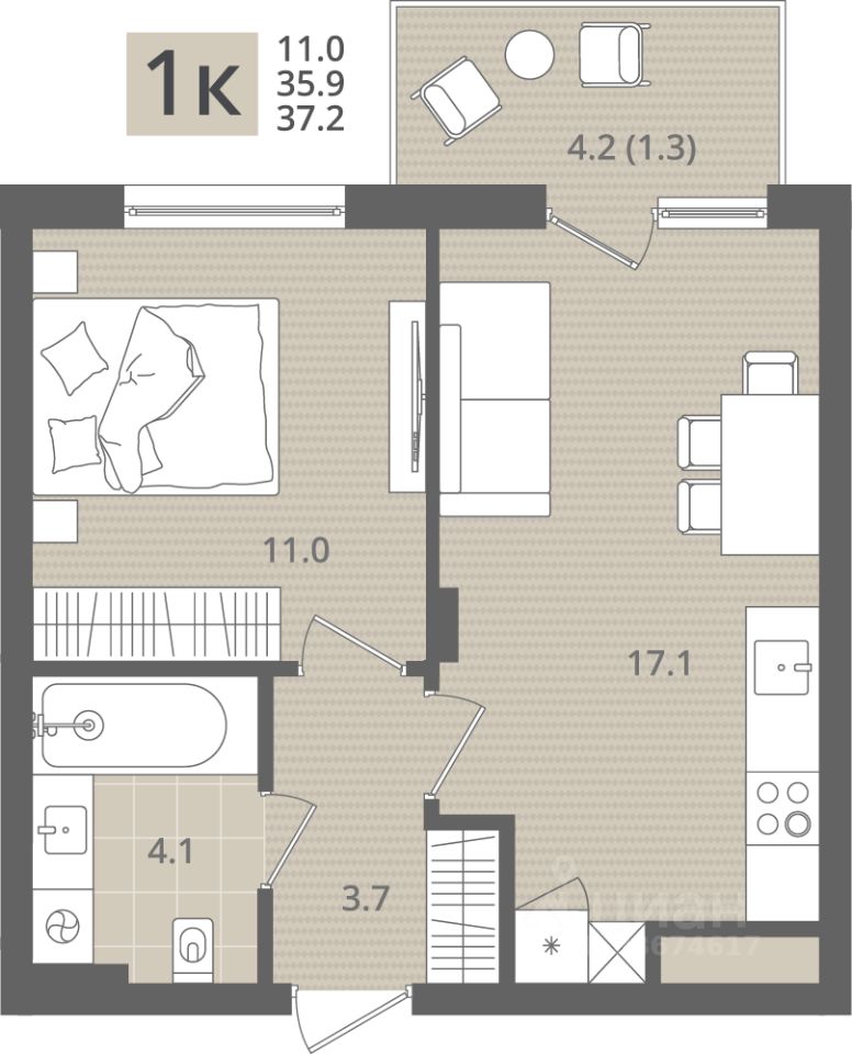 Продаётся 1-комнатная квартира в строящемся доме (Дом 1.2), срок сдачи: IV-кв. 2026, общей площадью 37.2 кв.м., на 6 этаже. Новый жилой комплекс "МОре" от Строительной компании "Меркурий" расположен по адресу: Калининградская область, г. Пионерский, пос. Рыбное.