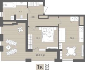 Продаётся 1-комнатная квартира в строящемся доме (Дом 1.2), срок сдачи: IV-кв. 2026, общей площадью 53.6 кв.м., на 7 этаже. Новый жилой комплекс "МОре" от Строительной компании "Меркурий" расположен по адресу: Калининградская область, г. Пионерский, пос. Рыбное.