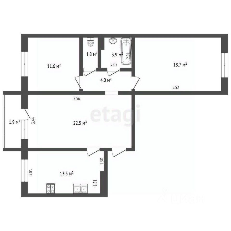 Просторная площадь: Кухня гостиная 36 м2 и две комнаты 18,7/11,6 м2 позволяют организовать пространство под любые нужды семьи — будь то детская комната, кабинет или гостиная зона.