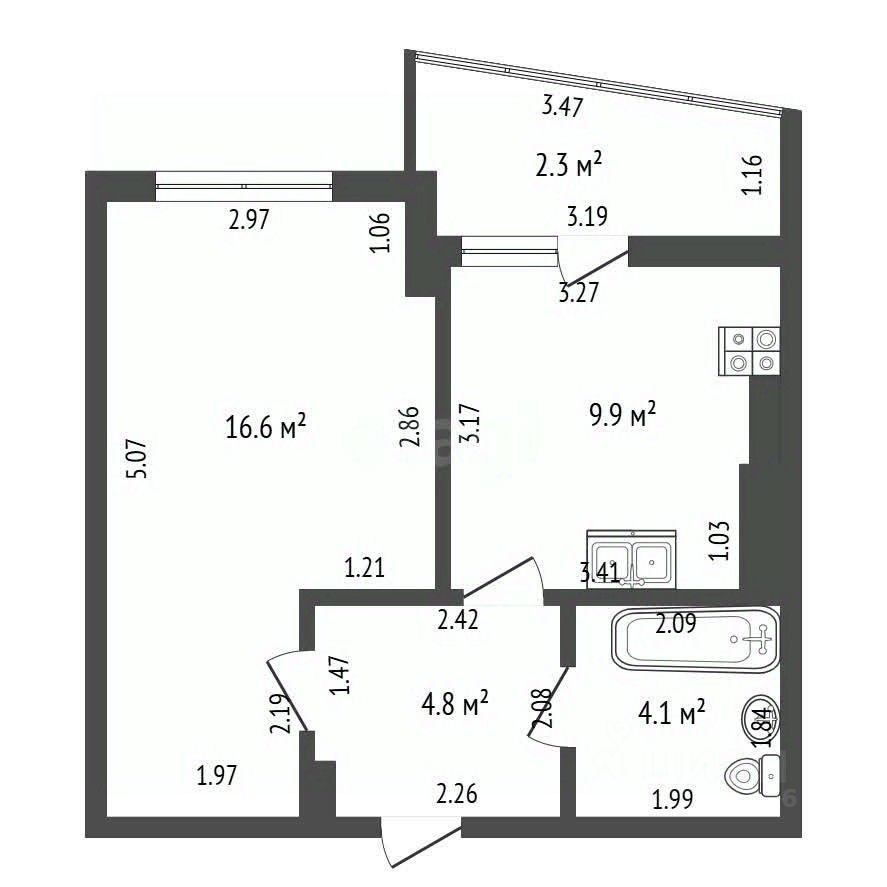 Площадь квартиры 37,7 кв.м.: кухня - 10 кв.м., комната - 16,6 кв.м., санузел- 4,1 кв. м.