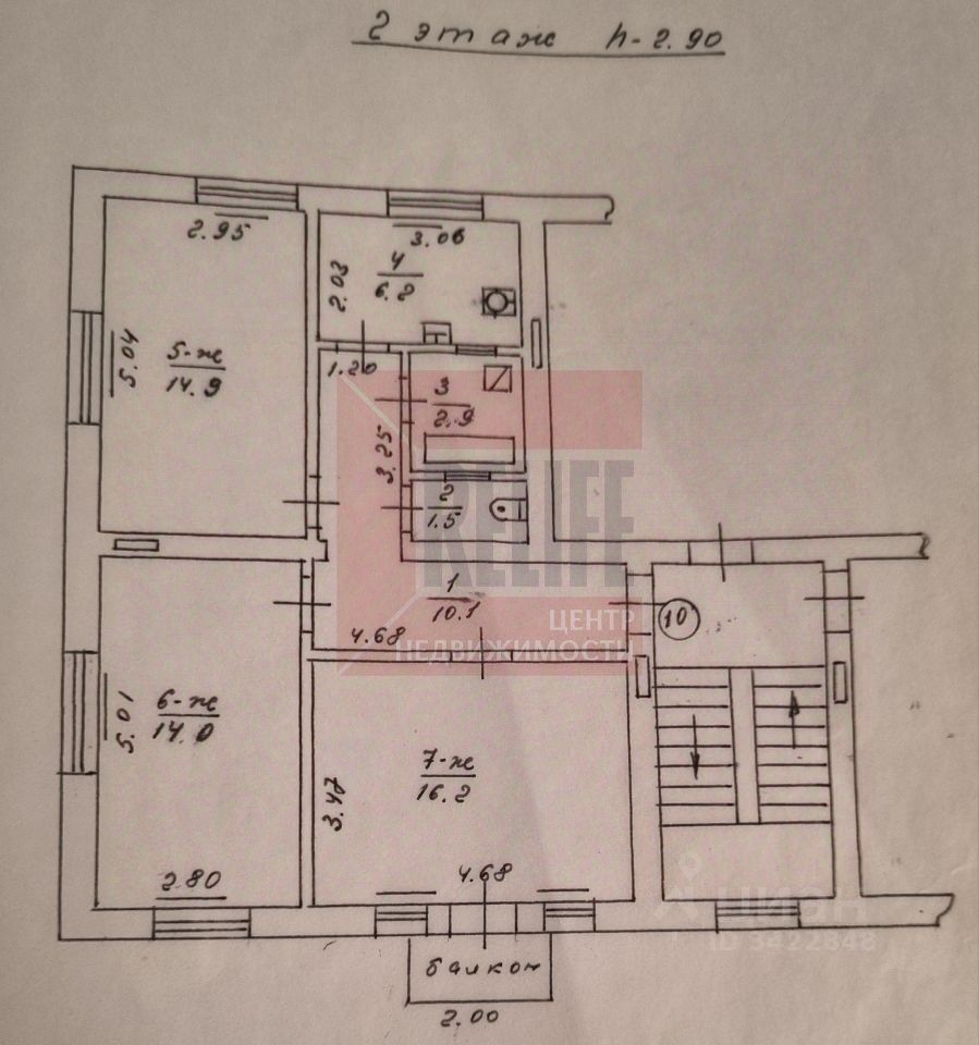 Общая площадь квартиры 66,4 кв. м., три изолированные комнаты: 16,2 кв. м с выходом на балкон, 14,0 кв. м и 14,9 кв. м с двумя окнами каждая, раздельный санузел 2,9 кв. м и 1,5 кв. м, коридор 10 кв. м, высота потолков 2,9 м. кв., кухня 6,2 кв. м. Окна квартиры выходят во двор и на улицу.