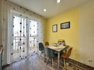 Продажа включает удобную обстановку: остаётся современный кухонный гарнитур с вместительным холодильником, функциональная мебель в жилой зоне и коридоре.
