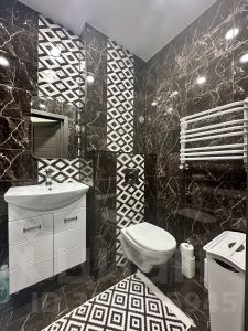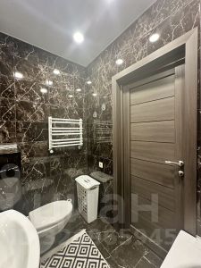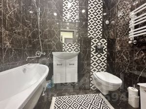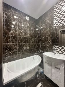 Просторный совместный санузел, где помещается вся необходимая сантехника, включая глубокую ванну и стиральную машинку.