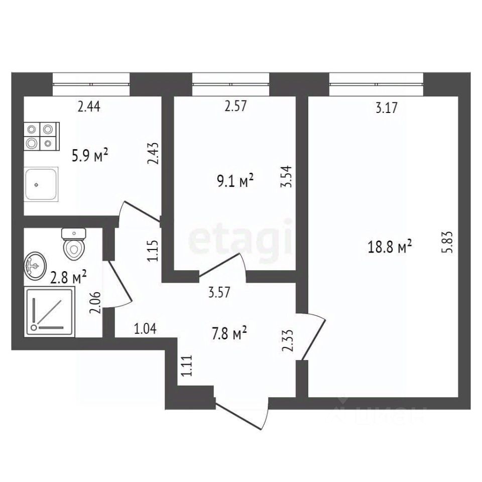 Квартира теплая, светлая. Планировка практичная и рациональная: 2 изолированные комнаты общей жилой площадью 27,9 кв. м, кухня 7 кв. м с встроенной мебелью. Высота потолков 2.5 метра.