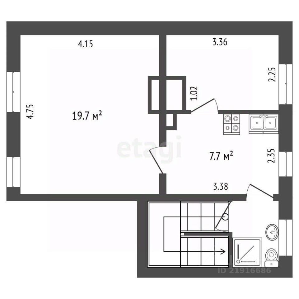 Комнаты изолированные: 7,5 м2 и 19,7 м2. Кухня - 7,7 м2. Окна на разные стороны.