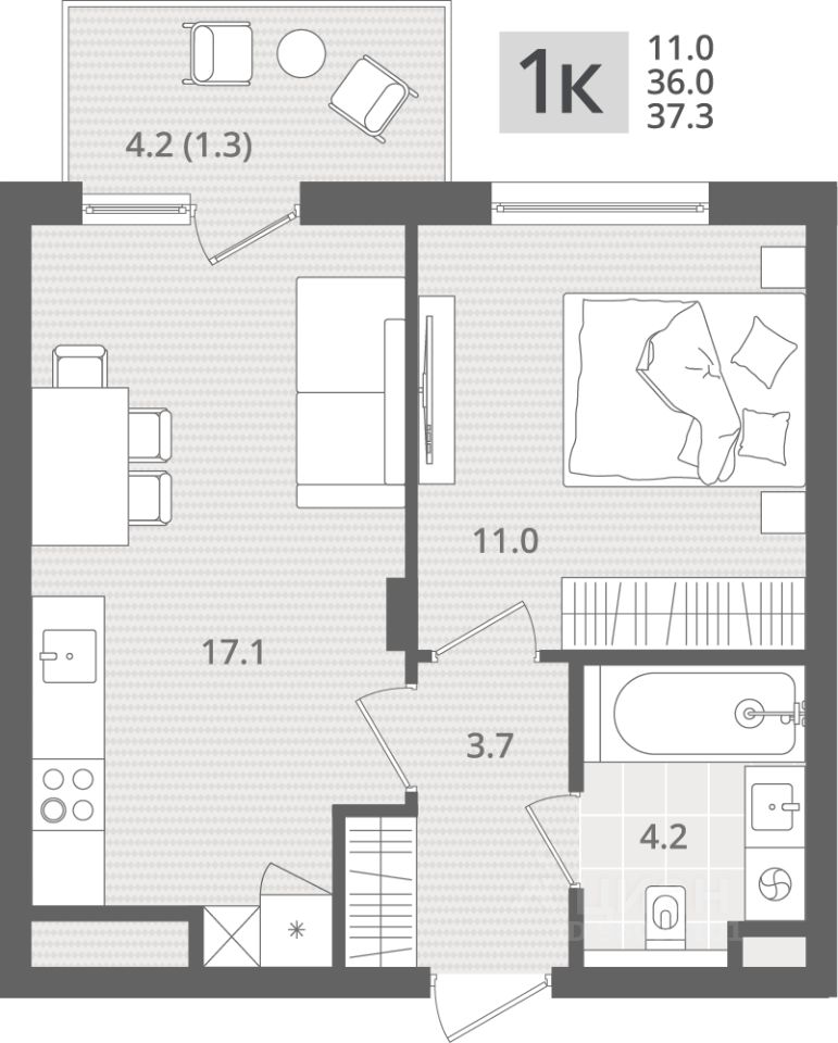 Продаётся 1-комнатная квартира в строящемся доме (Дом 1.2), срок сдачи: IV-кв. 2026, общей площадью 37.3 кв.м., на 7 этаже. Новый жилой комплекс "МОре" от Строительной компании "Меркурий" расположен по адресу: Калининградская область, г. Пионерский, пос. Рыбное.
