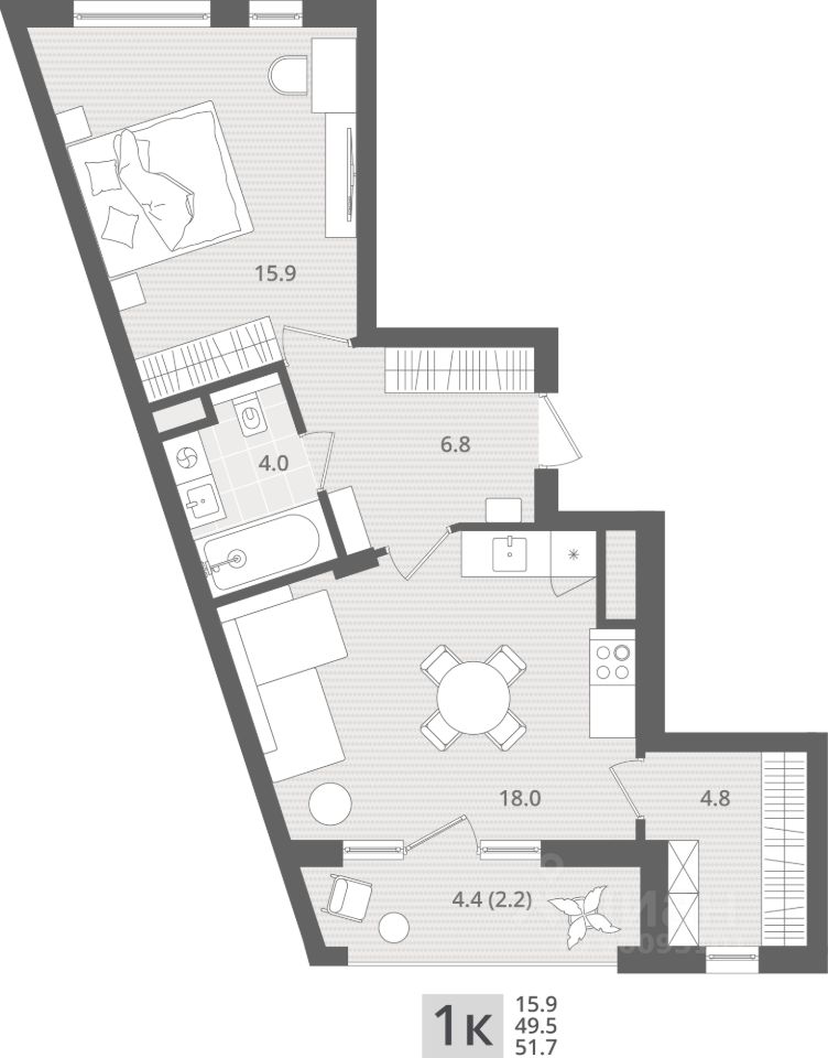 Продаётся 1-комнатная квартира в строящемся доме (Дом 1.1), срок сдачи: IV-кв. 2026, общей площадью 51.7 кв.м., на 6 этаже. Новый жилой комплекс "МОре" от Строительной компании "Меркурий" расположен по адресу: Калининградская область, г. Пионерский, пос. Рыбное.
