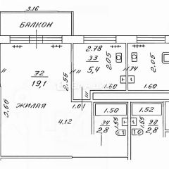 Общая площадь составляет 32 кв. м, из которых 19,1 кв. м — жилая площадь, 6 кв. м — кухня.