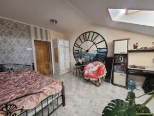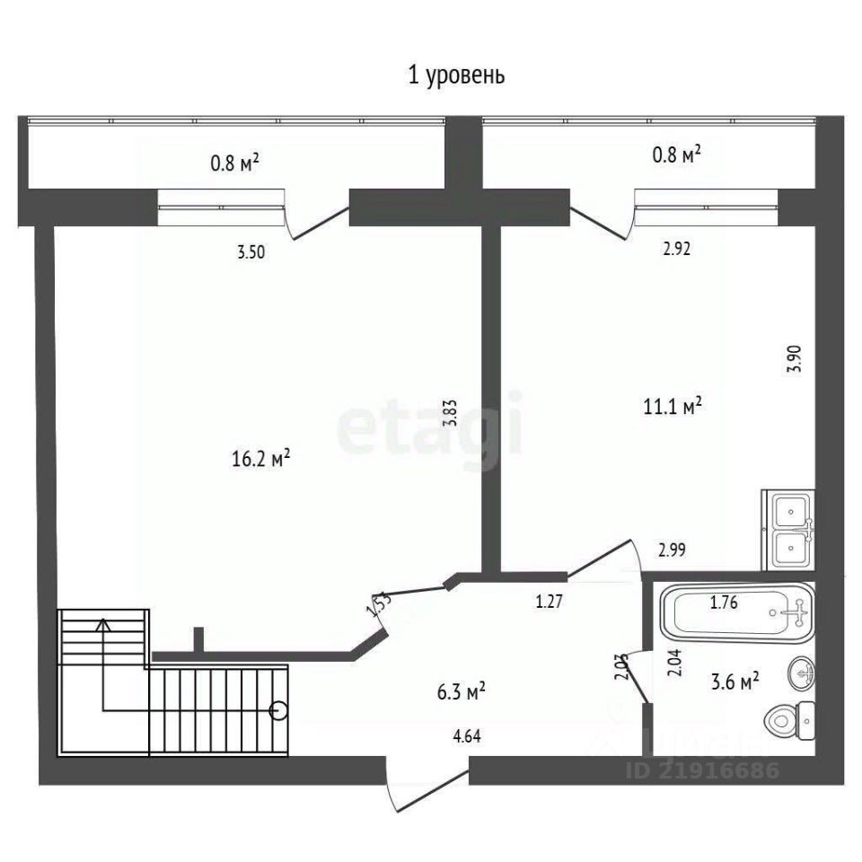 На первом уровне расположены кухня с закрытым балконом, просторная комната с открытым балконом и ванная.
