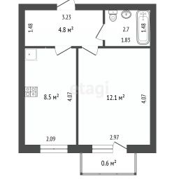 Для небольшой квартиры отличная организация пространства: просторная кухня 8,5 м² (редкость для такого метража!) и жилая комната 12,1 м².
