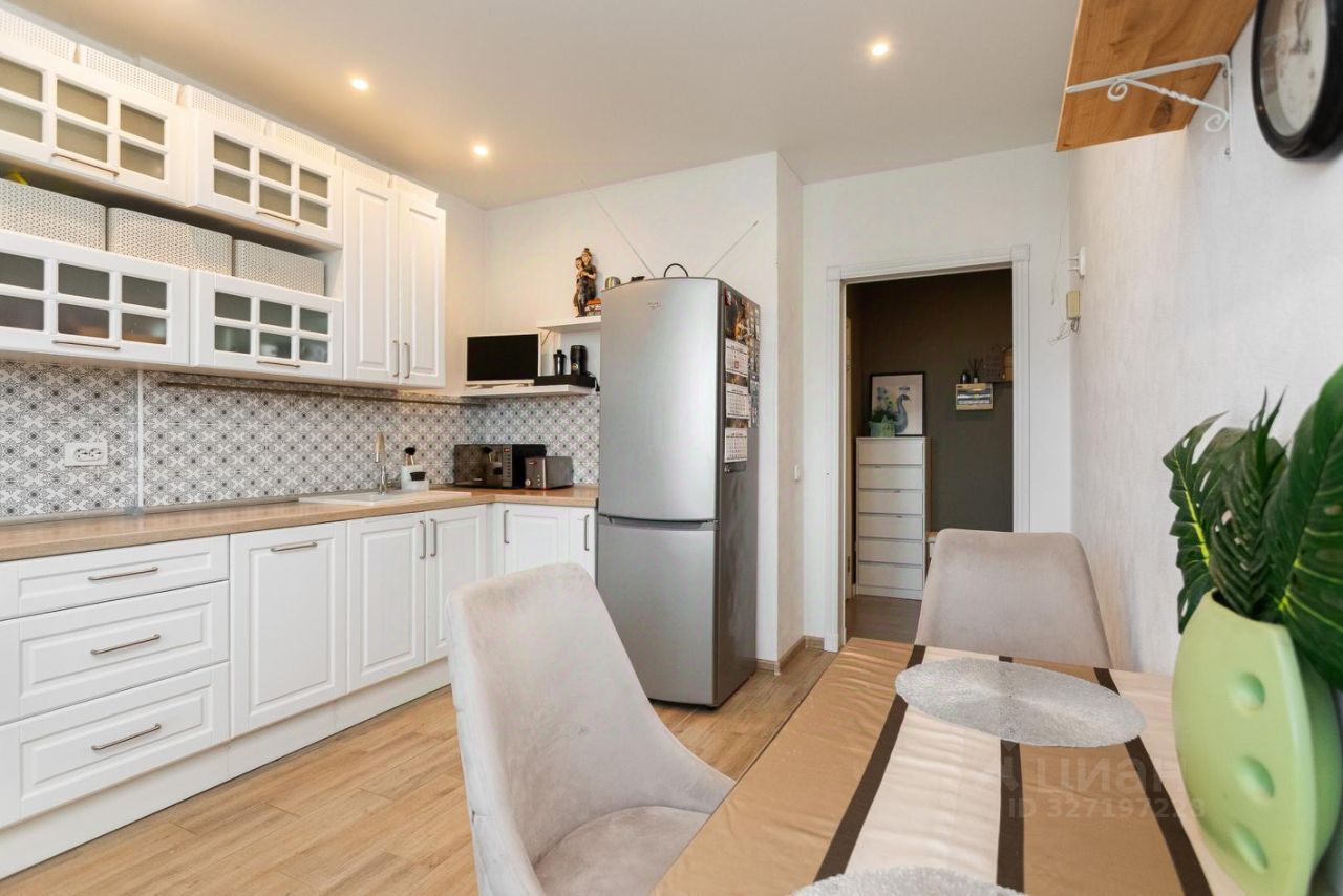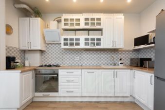 Просторная кухня 12.8 м с кухонным гарнитуром, встроенной техникой, с холодильником, плитой, духовым шкафом, вытяжкой, посудомоечной машиной, микроволновкой.