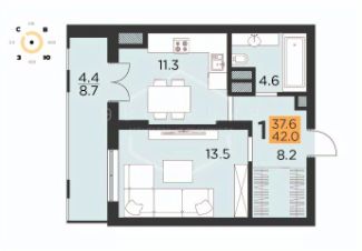 Общая площадь квартиры 37.5 кв.м, кухня-столовая 11.3 кв.м с выходом на лоджию 8.7 кв.м с витражной системой остекления "Авангард", спальня 13.5 кв.м, холл с гардеробной и ванная комната. Окна выходят на северо-запад и открывают потрясающий вид на центральный район города.