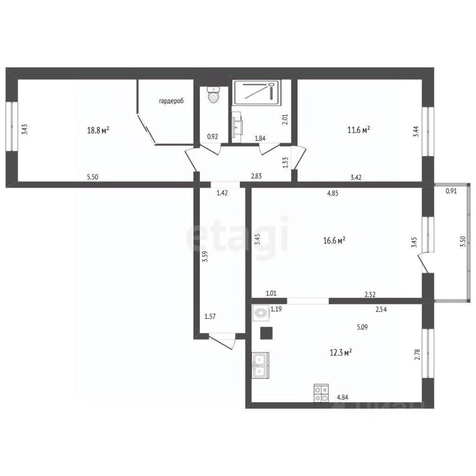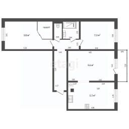 Три раздельные комнаты: спальня с гардеробом (19 м²), вторая спальня (11,7 м²) и просторная гостиная (16,7 м²)