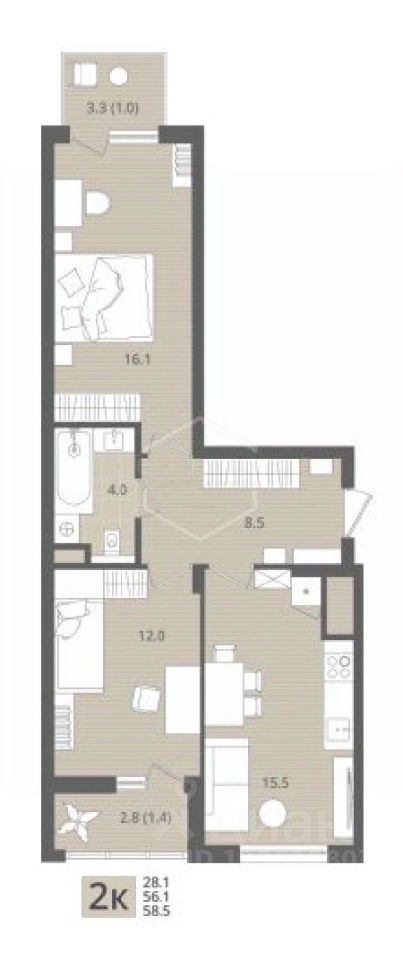 Квартира: 2 к 58,50 кв.м., 3 этаж в комплексе МОре, 1 очередь, корп.1.1, сдача: 4кв. , этажей: 7, адрес Пионерский г., Рабочая ул., , Застройщик: СК Меркурий.