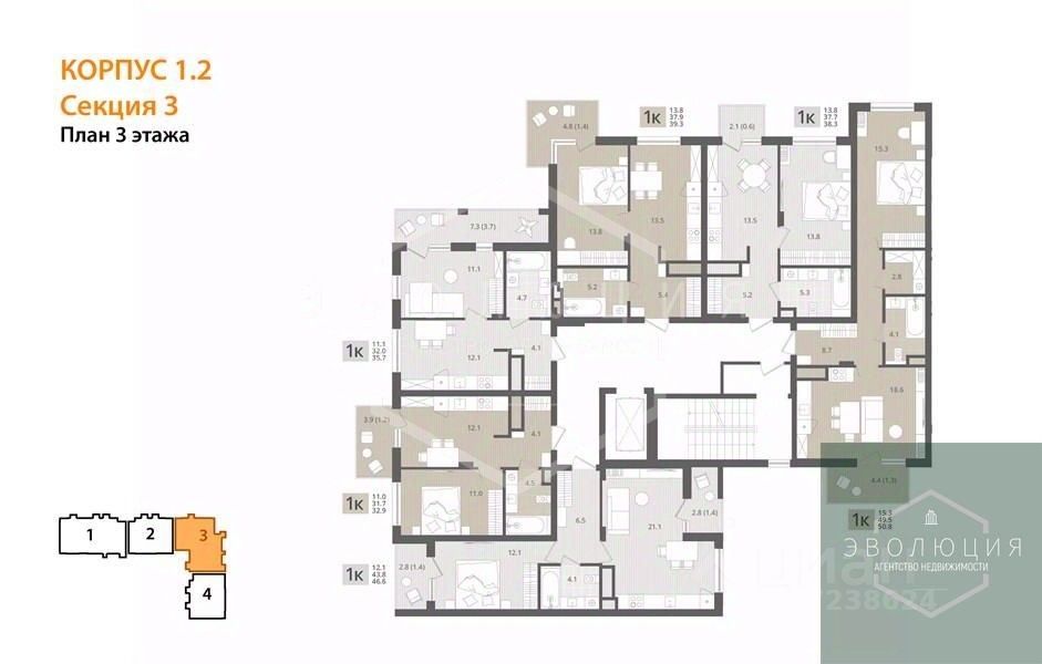 Квартира: 1 к 50,80 кв.м., 3 этаж в комплексе МОре, 1 очередь, корп.1.2, сдача: 4кв. , этажей: 7, адрес Пионерский г., Рабочая ул., , Застройщик: СК Меркурий.