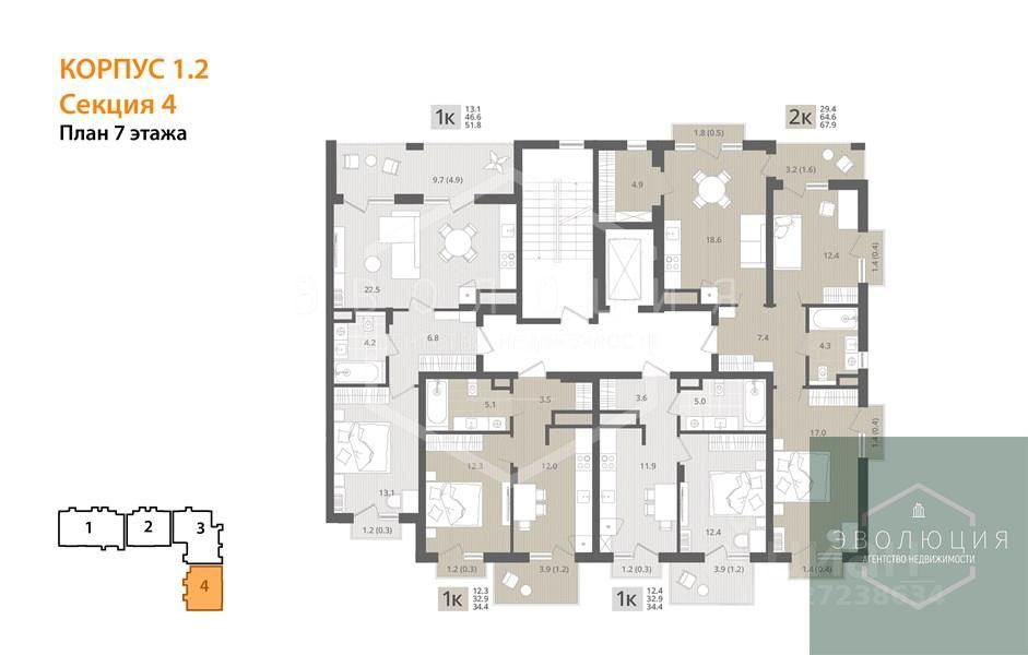 Квартира: 1 к 34,40 кв.м., 7 этаж в комплексе МОре, 1 очередь, корп.1.2, сдача: 4кв. , этажей: 7, адрес Пионерский г., Рабочая ул., , Застройщик: СК Меркурий.