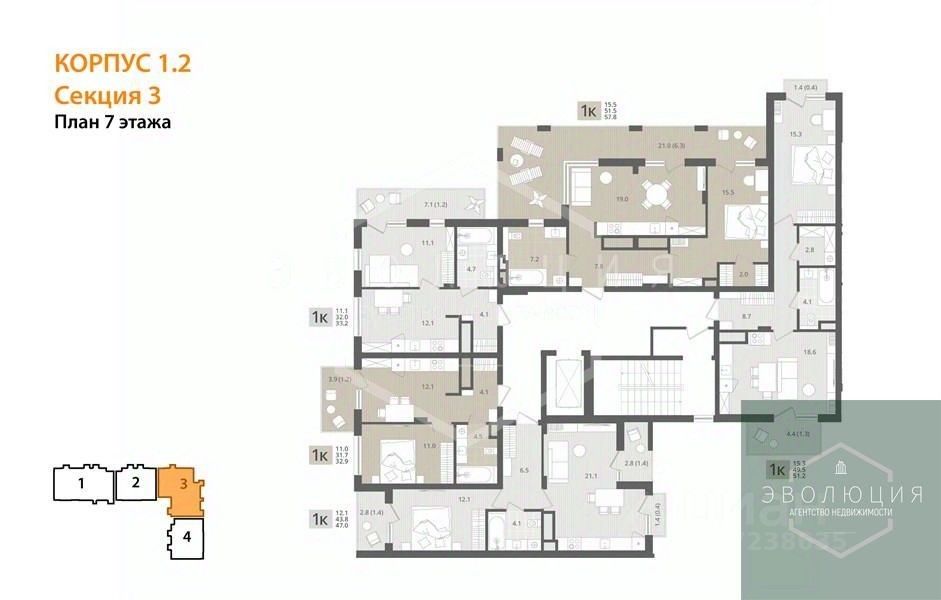 Квартира: 1 к 47,00 кв.м., 7 этаж в комплексе МОре, 1 очередь, корп.1.2, сдача: 4кв. , этажей: 7, адрес Пионерский г., Рабочая ул., , Застройщик: СК Меркурий.