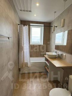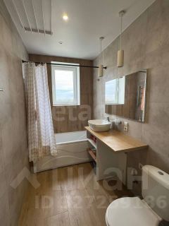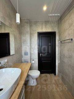 Теплая плитка под бетон, деревянная тумба, стильный светильник, окно — свежий воздух и естественный свет. Здесь приятно принимать душ и расслабляться после рабочего дня.