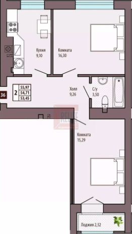 Кухня 9,46 м², две комнаты (16,3 и 15,29 м²). Из второй комнаты выход на лоджию. Большая прихожая 9,46 м² поместится гардеробная.