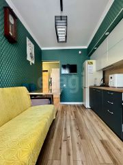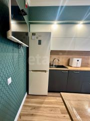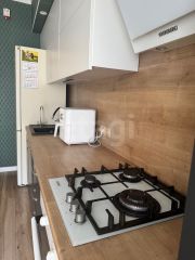 Кухня-гостиная в 18,7 м² укомплектована стильной мебелью и современной бытовой техникой. Вся техника новая, в использовании была недолго.