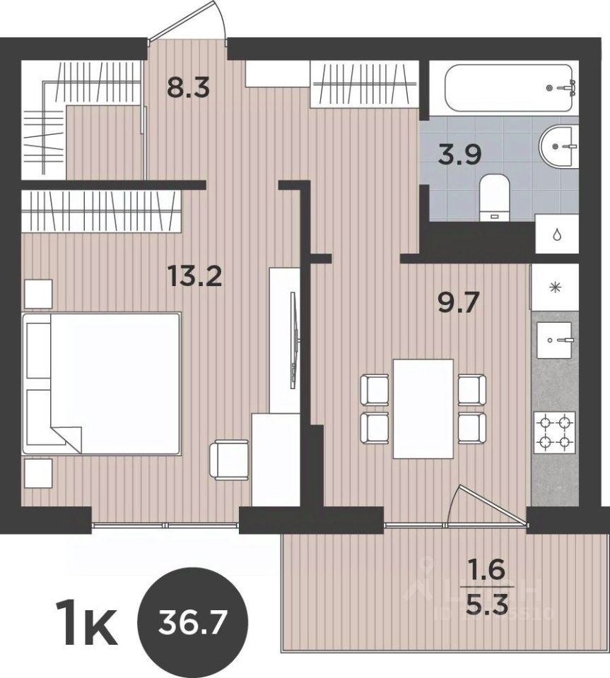 Общая площадь - 36.7 кв.м ,Кухня - 9,7 кв. м ,Спальня - 15,2 кв. м ,Прихожая- 8,3кв. м ,с/у- 3,9 кв. м ,